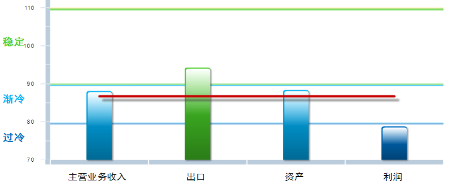 从分项指数环比变化看,主营业务收入、出口、利润、资产四项指数环比上月均有小幅回落,其中:主营业务收入景气指数88.13,位于“渐冷”区间,较上月下降0.34点;出口景气指数为94.28,位于“稳定”区间,较上月下降0.54点;资产景气指数为99.38,位于“渐冷”区间,较上月下降0.65点;利润景气指数78.82,位于“过冷”区间,较上月下降0.86点。