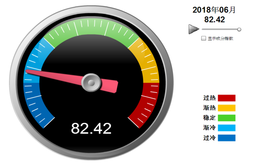 据中国轻工业经济运行及预测预警系统数据显示,2018年6月中国农副食品加工业景气指数为82.42,处在蓝色“渐冷”区间,较4月回升0.29。