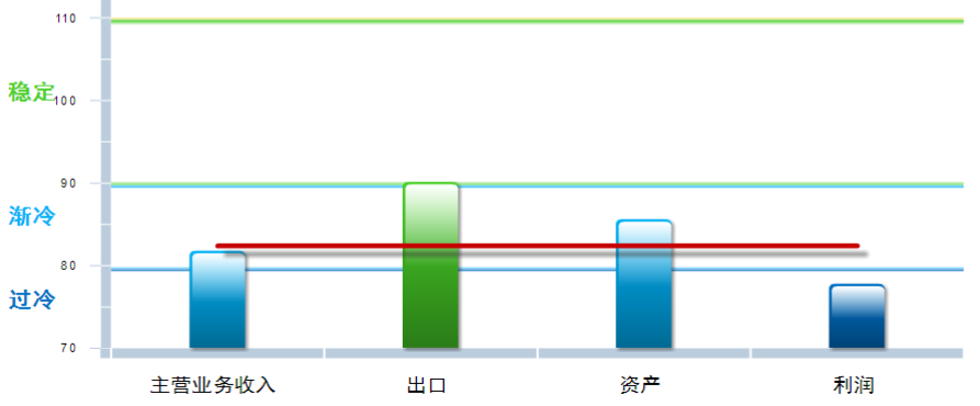 从分项指数环比变化看,出口景气指数有较明显回升,其他三项指数均有小幅下降,其中:主营业务收入景气指数81.82,位于“渐冷”区间,较上月下降0.14点;出口景气指数为90.14,位于“稳定”区间,较上月上升3.47点;资产景气指数为85.64,位于“渐冷”区间,较上月下降0.59点;利润景气指数77.81,位于“过冷”区间,较上月回升0.67点。