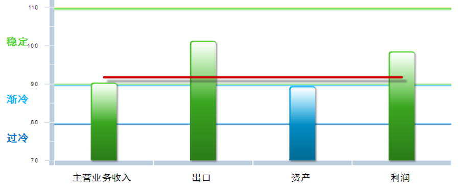 从分项指数环比变化看,主营收入、资产景气指数回升,出口、利润景气指数下降,其中:主营业务收入景气指数90.36,位于“稳定”区间,较上月回升0.31点;出口景气指数为101.27,位于“稳定”区间,较上月下降8.92点;资产景气指数为89.41,位于“渐冷”区间,较上月回升0.38点;利润景气指数98.50,位于“稳定”区间,较上月下降2.45点。