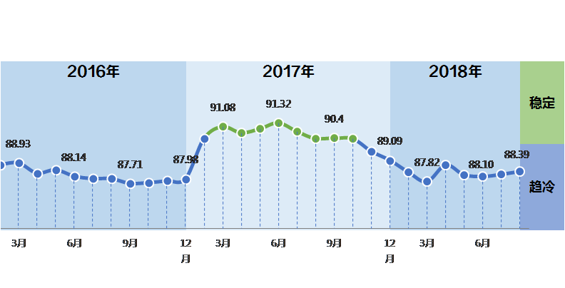 中国轻工业经济运行及预测预警系统数据显示:2018年开年,中轻景气指数延续去年四季度以来的下降态势,连续8个月在蓝色“趋冷”区间波动,6月以后呈现稳中缓升态势。8月中轻景气指数为88.39,环比7月上升0.15点,较去年同期下降1.99点。