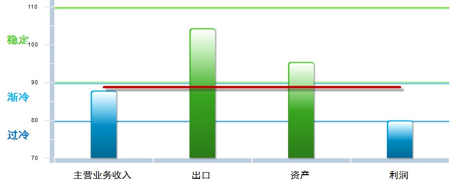 四项分项指数中环比上月均有回升,其中:主营业务收入景气指数87.92,位于“渐冷”区间,较上月上升0.03点;出口景气指数为104.38,位于“稳定”区间,较上月上升4.96点;资产景气指数为95.48,位于“稳定”区间,较上月下降0.66点;利润景气指数80.05,位于“渐冷”区间,较上月上升0.36点。