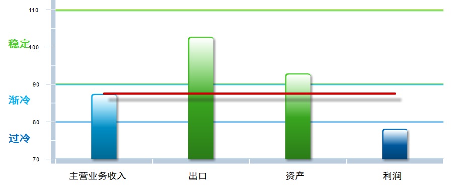 四项分项景气指数环比均有下降,其中:主营业务收入景气指数87.47,位于“渐冷”区间,较上月下降0.73点;出口景气指数为102.73,位于“稳定”区间,较上月下降1.06点;资产景气指数为92.95,位于“稳定”区间,较上月下降0.88点;利润景气指数78.11,位于“过冷”区间,较上月下降1.09点。