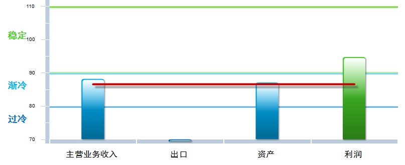 四项分项景气指数环比上月均有回升,出口景气指数上升幅度较大,其中:主营业务收入景气指数88.17,位于“渐冷”区间,较上月回升0.45点;出口景气指数为69.71,位于“过冷”区间,较上月回升24.36点;资产景气指数为87.11,位于“渐冷”区间,较上月回升0.58点;利润景气指数94.75,位于“稳定”区间,较上月上升1.9点。