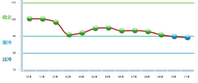 分项景气指数中,主营业务收入景气指数环比小幅回升,其他三项指数环比下降,出口景气指数上升幅度较大,其中:主营业务收入景气指数91.37,位于“稳定”区间,较上月回升0.09点;出口景气指数为100.86,位于“稳定”区间,较上月下降0.99点;资产景气指数为90.66,位于“稳定”区间,较上月下降0.25点;利润景气指数76.67,位于“过冷”区间,较上月下降2.69点。
