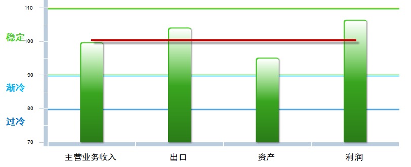 分项景气指数中,主营业务收入和资产景气指数环比下降,出口和利润景气指数回升,其中:主营业务收入景气指数99.80,位于“稳定”区间,较上月下降0.46点;出口景气指数为104.15,位于“稳定”区间,较上月上升3.16点;资产景气指数为95.18,位于“稳定”区间,较上月下降3.77点;利润景气指数106.43,位于“稳定”区间,较上月上升1.72点。