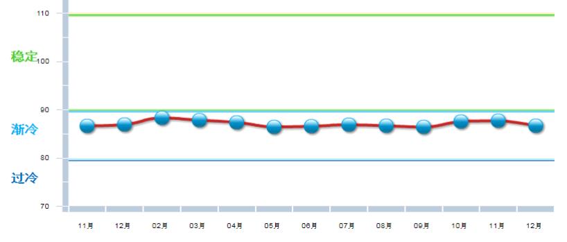 据中国轻工业经济运行及预测预警系统数据显示,2018年12月食品制造业景气指数86.67,处在“渐冷”区间,较11月下降1.02点。