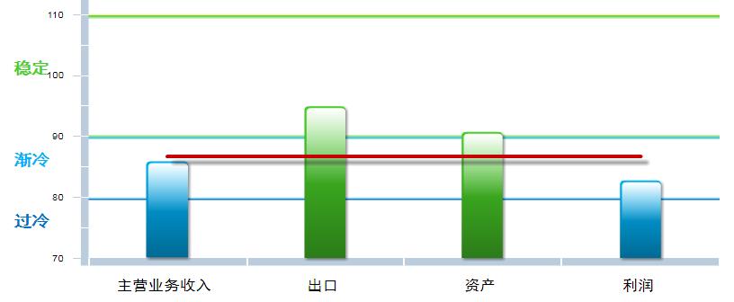 分项景气指数中,资产景气指数环比小幅上升,其他三项分项景气指数均有下降,其中:主营业务收入景气指数85.86,位于“渐冷”区间,较上月下降0.12点;出口景气指数为94.92,位于“稳定”区间,较上月下降8.42点;资产景气指数为90.70,位于“稳定”区间,较上月回升0.28点;利润景气指数82.73,位于“渐冷”区间,较上月下降1.05点。
