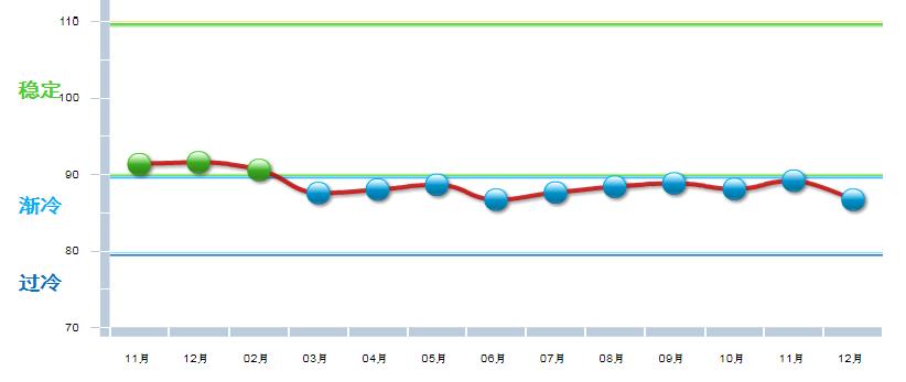 据中国轻工业经济运行及预测预警系统数据显示,2018年12月家具行业景气指数86.69,处在“渐冷”区间,较11月下降2.47点。
