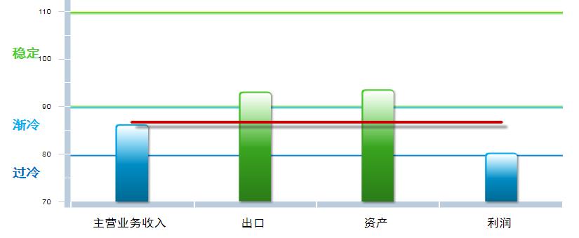 四项分项景气指数环比11月均有下降,出口景气指数下降幅度较大,其中:主营业务收入景气指数86.24,位于“渐冷”区间,较上月下降1.13点;出口景气指数为93.08,位于“稳定”区间,较上月下降16.16点;资产景气指数为93.56,位于“稳定”区间,较上月下降1.69点;利润景气指数80.28,位于“渐冷”区间,较上月下降0.9点。