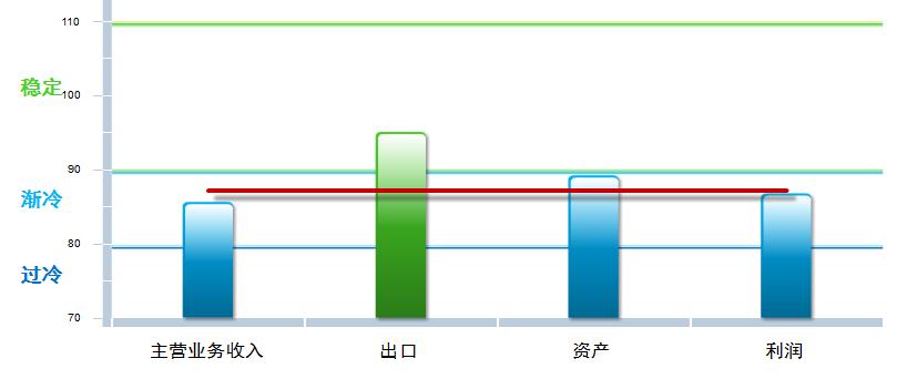 分项景气指数中,出口、利润景气指数较去年末回升,营业收入、资产景气指数下降,其中:主营业务收入景气指数85.59,位于“渐冷”区间,较去年末下降0.29点;出口景气指数为95.06,位于“稳定”区间,较去年末回升0.14点;资产景气指数为89.18,位于“渐冷”区间,较去年末下降1.52点;利润景气指数86.76,位于“渐冷”区间,较去年末回升4.03点。