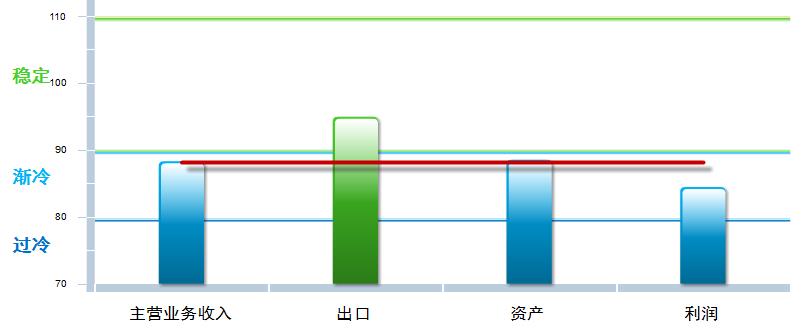 分项景气指数中,出口、资产景气指数较去年末小幅下降,营业收入、利润指数回升,其中:营业收入景气指数88.29,位于“渐冷”区间,较去年末回升0.61点;出口景气指数为94.94,位于“稳定”区间,较去年末下降1.44点;资产景气指数为88.52,位于“渐冷”区间,较去年末下降1.64点;利润景气指数84.45,位于“渐冷”区间,较去年末回升3.33点。