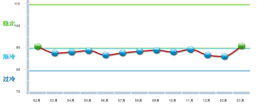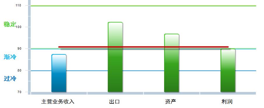 分项景气指数中,除资产指数环比2月小幅下降外,其他三项分项指数均有回升,利润指数回升幅度较大,其中:营业收入景气指数87.52,位于“渐冷”区间,较2月回升2.54点;出口景气指数为102.39,位于“稳定”区间,较2月上升4.05点;资产景气指数为96.95,位于“稳定”区间,较2月下降0.16点;利润景气指数90.07,位于“稳定”区间,较2月上升14.15点。