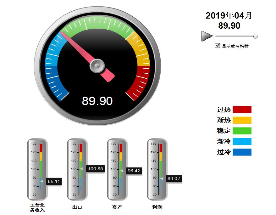 分项景气指数中,除资产指数外,其他三项环比3月均有下降,其中:营业收入景气指数86.11,位于“渐冷”区间,较3月下降1.41点;出口景气指数为100.85,位于“稳定”区间,较3月下降1.54点;资产景气指数为98.42,位于“渐冷”区间,较3月回升1.47点;利润景气指数89.07,位于“渐冷”区间,较3月下降1.0点。