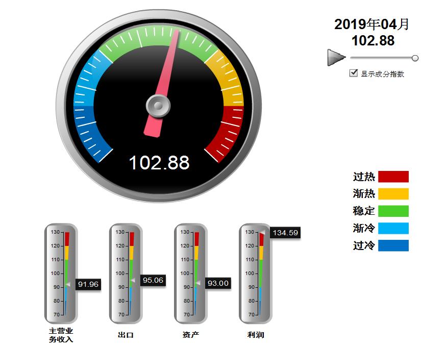 四项分项景气指数环比3月均有下降,利润指数下降幅度较大。其中:营业收入景气指数91.96,位于“稳定”区间,较3月下降1.3点;出口景气指数为95.06,位于“稳定”区间,较3月下降5.79点;资产景气指数为93.00,位于“稳定”区间,较3月下降1.5点;利润景气指数134.59,位于“过热”区间,较3月下降41.28点。