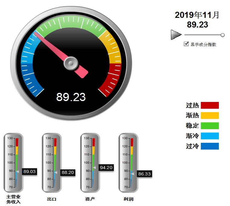 分项景气指数中,营收、利润、资产景气指数环比上月均有回升,出口景气指数下降幅度较大,其中:营业收入景气指数89.03,位于“渐冷”区间,较10月回升0.16点;出口景气指数为88.20,位于“渐冷”区间,较10月下降6.79点;资产景气指数为94.20,位于“稳定”区间,较10月回升1.28点;利润景气指数86.33,位于“渐冷”区间,较10月回升0.35点。