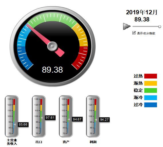 分项景气指数中,营收、利润景气指数环比上月有回升,出口、资产景气指数环比下降,其中:营业收入景气指数85.66,位于“渐冷”区间,较11月回升0.22点;出口景气指数为97.61,位于“稳定”区间,较11月下降0.83点;资产景气指数为94.67,位于“稳定”区间,较11月下降0.28点;利润景气指数94.27,位于“稳定”区间,较11月回升0.44点。