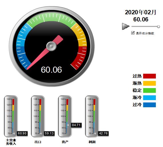 四项分项景气指数均较去年末下降,除资产景气指数外,营收、出口、利润景气指数均较上年末大幅下降,且均跌入“过冷”区间,其中:营业收入景气指数60.90,位于“过冷”区间,较上年末下降24.55点;出口景气指数为59.13,位于“过冷”区间,较上年末下降46.13点;资产景气指数为84.71,位于“趋冷”区间,较上年末下降0.16点;利润景气指数42.76,位于“过冷”区间,较上年末下降47.05点。