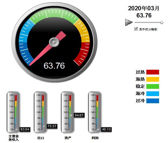 四项分项景气指数均较上月回升,利润、出口景气指数回升幅度较大,其中:营业收入景气指数63.04,位于“过冷”区间,较上月回升5.69点;出口景气指数为75.57,位于“过冷”区间,较上月回升12.75点;资产景气指数为94.67,位于“稳定”区间,较上月回升1.64点;利润景气指数40.13,位于“过冷”区间,较上月回升15.19点。