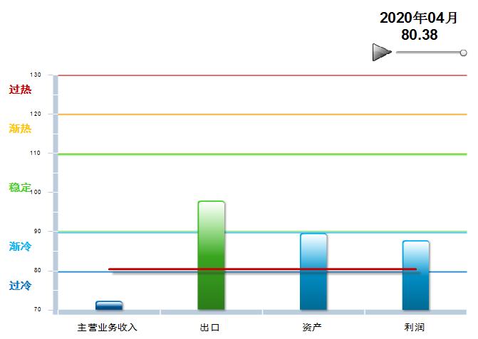 分项景气指数中,营收、利润、资产景气指数环比上月均有上升,出口景气指数环比小幅下降,其中:营业收入景气指数67.29,位于“过冷”区间,环比上升5.7点;出口景气指数为97.90,位于“稳定”区间,环比下降0.55点;资产景气指数为89.66,位于“趋冷”区间,环比回升0.66点;利润景气指数87.79,位于“趋冷”区间,环比上升9.15点。