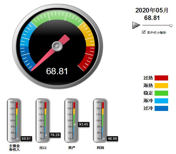 分项景气指数中,资产景气指数环比小幅下降,营收、利润、出口景气指数环比均有回升,其中:营业收入景气指数68.91,位于“过冷”区间,环比上升1.62点;出口景气指数为76.20,位于“过冷”区间,环比上升2.64点;资产景气指数为93.45,位于“稳定”区间,环比回升0.66点;利润景气指数48.98,位于“过冷”区间,环比上升0.66点。