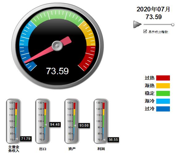 分项景气指数中,营收、利润、出口景气指数环比上月回升,资产景气指数环比下降。其中:营业收入景气指数71.79,位于“过冷”区间,环比上升1.55点;出口景气指数为94.48,位于“稳定”区间,环比上升7.53点;资产景气指数为93.08,位于“稳定”区间,环比下降0.57点;利润景气指数56.55,位于“过冷”区间,环比上升2.63点。