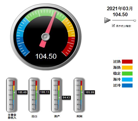 分项景气指数中,营收、利润、资产指数环比下降,出口指数环比大幅上升。其中:营业收入景气指数105.49,位于“稳定”区间,环比下降3.12点;出口景气指数为106.13,位于“稳定”区间,环比上升33.65点;资产景气指数为94.43,位于“稳定”区间,环比下降0.57点;利润景气指数105.99,位于“稳定”区间,环比下降17.5点。