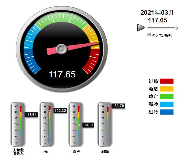 四项分项景气指数环比均下降,利润指数降幅较大。其中:营业收入景气指数115.61,位于“渐热”区间,环比下降8.12点;出口景气指数为122.32,位于“过热”区间,环比下降16.18点;资产景气指数为98.69,位于“稳定”区间,环比下降1.1点;利润景气指数132.79,位于“过热”区间,环比下降105.26点。