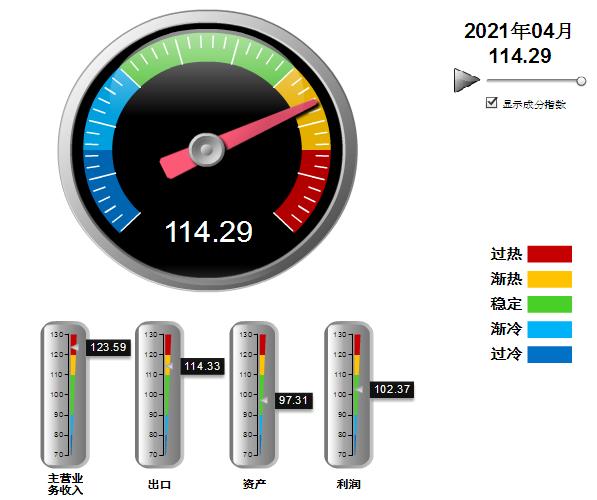 四项分项景气指数均环比下降,利润指数降幅较大。其中:营业收入景气指数123.59,位于“过热”区间,环比下降6.07点;出口景气指数为114.33,位于“趋热”区间,环比下降4.08点;资产景气指数为97.31,位于“稳定”区间,环比上升1.24点;利润景气指数102.37,位于“稳定”区间,环比下降32点。