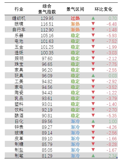 2021年9月, 对全国 25个重点行业进行监测,缝纫机械行业景气度位于“过热”区间;自行车、眼镜行业位于“渐热”区间,占8%。乐器、电池、五金等15个行业位于“稳定”区间,占60%。日化、钟表、玻璃等7个位于“渐冷”区间,占28%。缝纫机、玩具、日化、制笔行业景气指数环比上升,其他行业下降。整体行业景气情况如下:
