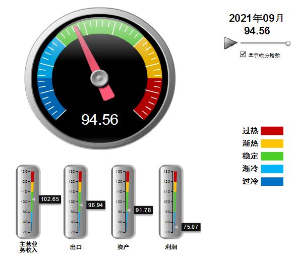 分项景气指数中,出口指数环比小幅上升,其他指数均有下降,其中:营业收入景气指数102.65,位于“稳定”区间,环比下降3.94点;出口景气指数为96.94,位于“稳定”区间,环比上升0.67点;资产景气指数为91.78,位于“稳定”区间,环比下降1.27点;利润景气指数75.07,位于“过冷”区间,环比下降5.72点。