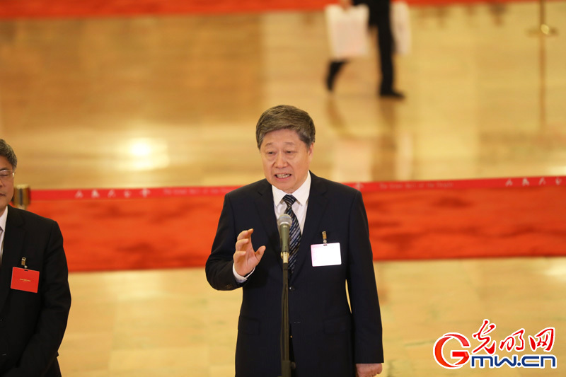 图为开幕会前,张瑞敏代表接受采访。(光明网记者 孙佳涵/摄)