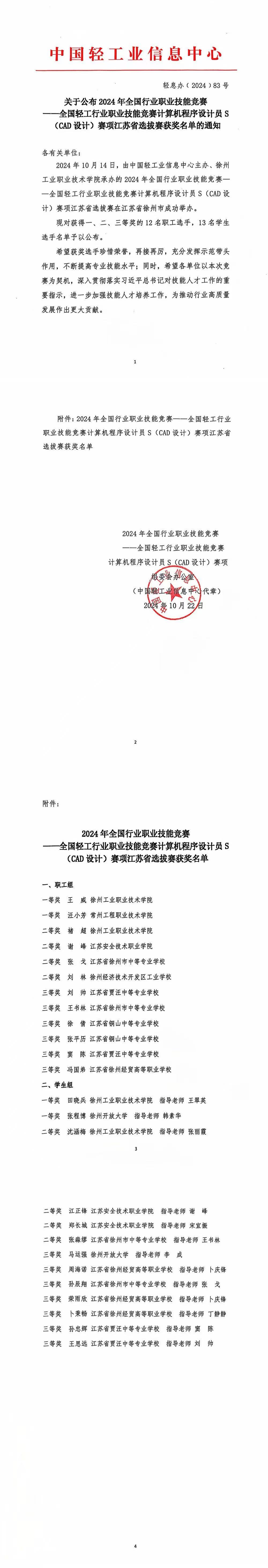 关于公布2024年全国行业职业技能竞赛——全国 职业技能竞赛计算机程序设计员S(CAD设计)赛项江苏省选拔赛获奖名单的通知
