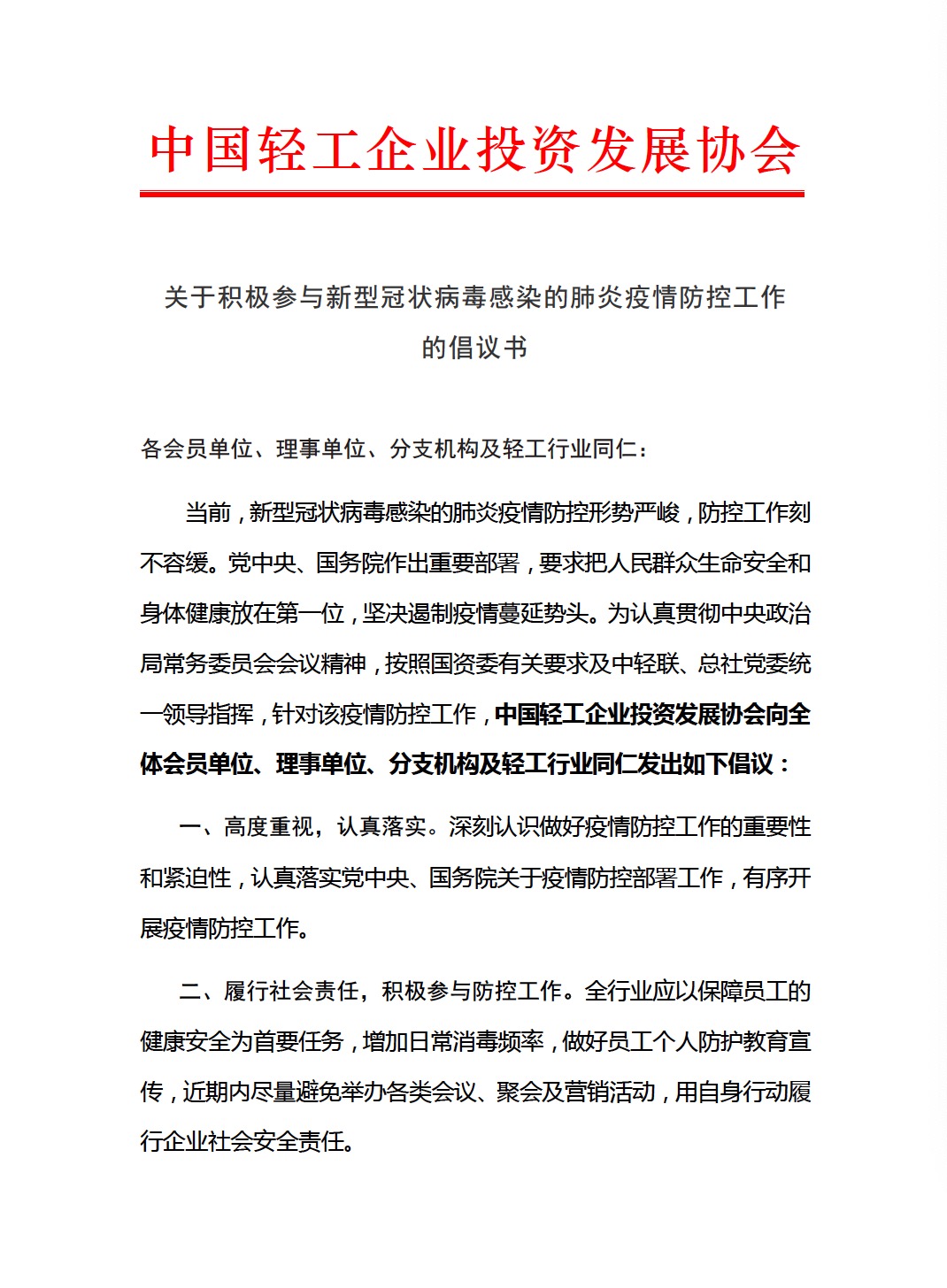 关于积极参与新型冠状病毒感染的肺炎疫情防控工作的倡议书