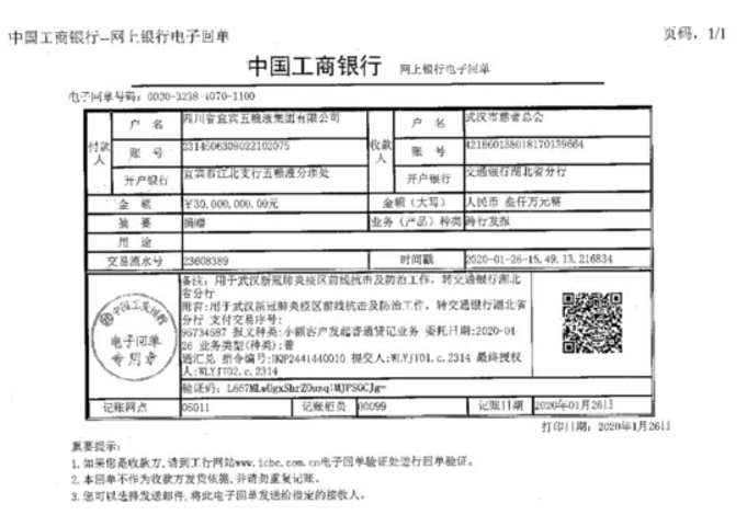 1月26日,五粮液集团首批向武汉市慈善总会捐款3000万元,用于支持当地抗击肺炎。目前,该笔款项已经通过转账方式直接汇入武汉市慈善总会账户。武汉市新冠肺炎防控指挥部接受捐赠相关负责人表示,捐赠的款物原则上由武汉市新冠肺炎防控指挥部统一调配使用。