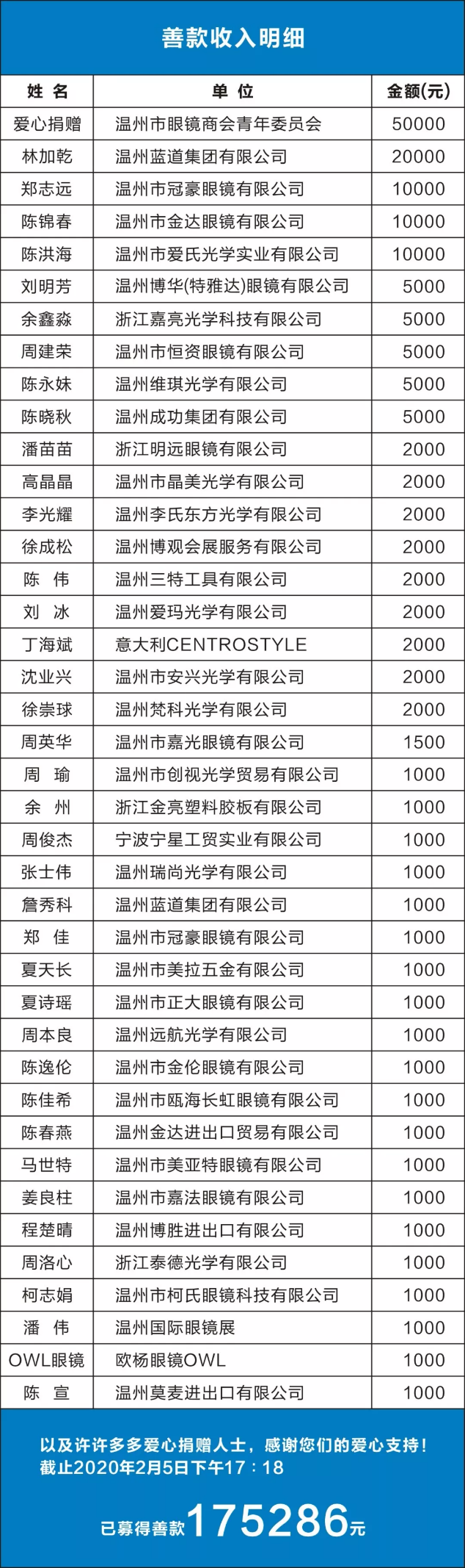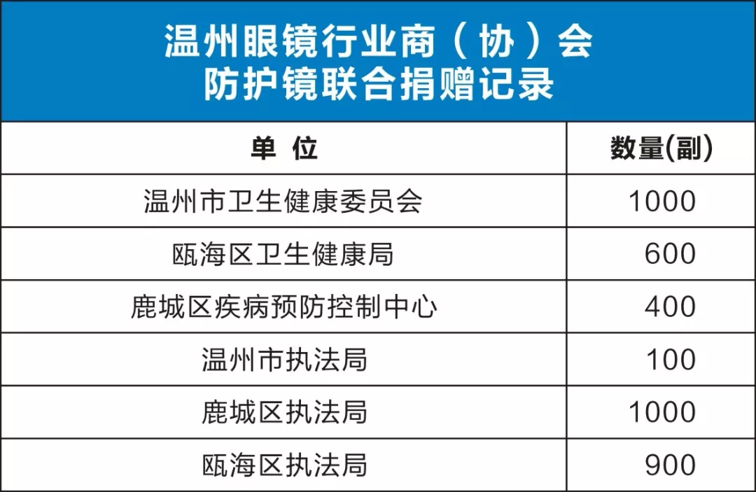 2020129日,温州市眼镜商会、温州市眼镜电商行业协会、温州市眼镜商会党支部、温州市眼镜商会青年委员会、温州市鹿城区眼镜行业协会、温州市瓯海区眼镜行业协会、中国(瓯海)眼镜跨境电商园,多家眼镜行业)会联合倡议:以温州眼镜行业名义开展防护镜捐赠活动,号召眼镜行业爱心人士慷慨解囊,共同出资统一采购防护镜,一周内募集善款175286元,专款专用采购防护镜,齐心呵护温州市民安全。