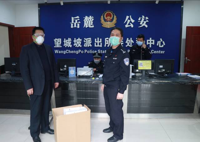 湖南省眼镜商会副会长单位湖南四精眼镜城有限公司何敬上总经理向望城坡公安派出所、街道各社区捐赠护目镜200副。