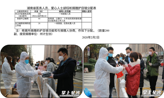 湖南省眼镜商会会员单位常德石门县精茂眼镜李军总经理为当地政府和当在一线工作人员赠送100余副护目镜,保障工作安全。