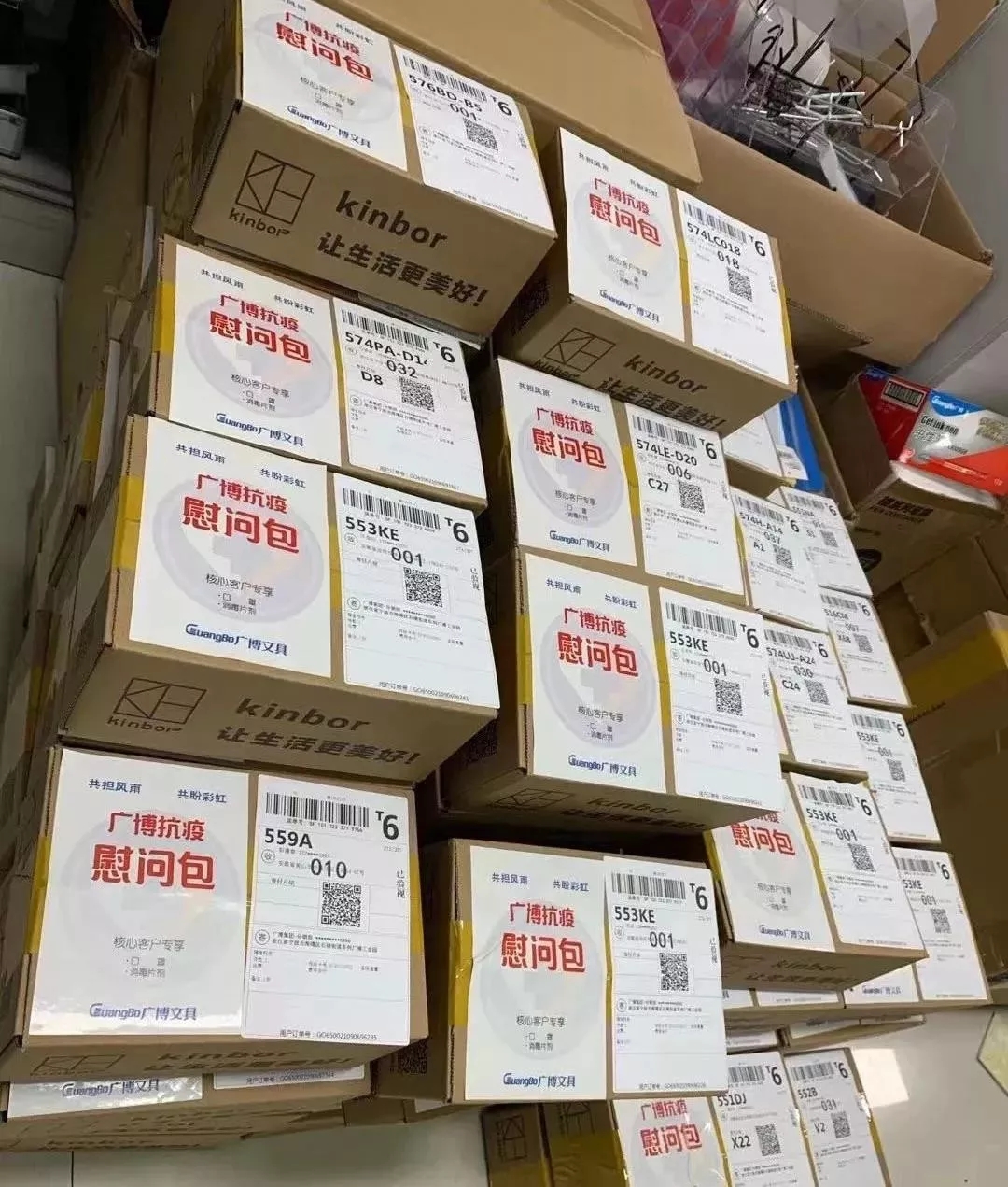 暖心房——广博为经销商送来抗疫慰问包。当前举国上下共抗“疫情”,口罩和各类消毒用品极度稀缺,广博集团排除万难,通过多种渠道集中采购口罩和消毒用品,为客户能在抗疫复工中的平安健康献上一份心意。