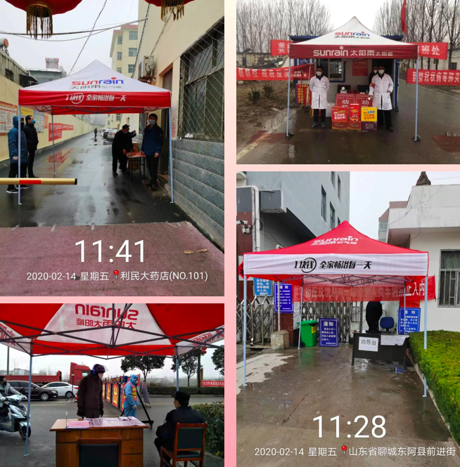 与此同时,全国各地的太阳雨经销商纷纷行动,为防疫检疫点捐赠善款和帐篷、大伞、食品、保温杯等物资。在村口、在小区、在街道,一顶顶红帐篷宣示着联防联控、群防群控的前沿阵地。太阳雨经销商在这场战“疫”中表现出了凝聚力和行动力,也彰显着全民战“疫”的强大战斗力。