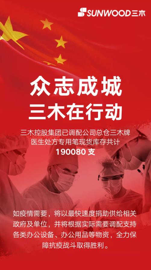 集团董事长牵头成立专项小组,开通绿色通道并整合资源,公司总仓三木牌医生处方专用笔现货库存共计190080支(其中G-009中性笔墨蓝181440支,P5按动式中性笔墨蓝8640支)。专项小组第一时间与疫情较重的湖北省武汉市红十字会和江西省红十字会取得联系,备案物资,如疫情需要我司将组织物流以最快速度捐助供给相关政府及单位,并将根据实际需要调配支持各类办公设备、办公用品等物资,全力保障抗疫战斗取得胜利。