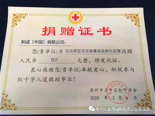 2020年初,随着新冠肺炎爆发,全国进入全民抗疫的阶段,吴中区台企联谊会第一时间向台商会员发起倡议,通过捐款捐物等形式来共同抗击疫情。截止2020年3月4日,吴中区台企联谊会共收到会员捐款58万元,捐给吴中区红十字会进行防疫工作。HCG和成卫浴作为吴中区台企联谊会的一员,也在第一时间捐赠5万元善款,用于支持吴中区的新冠肺炎疫情防控工作。