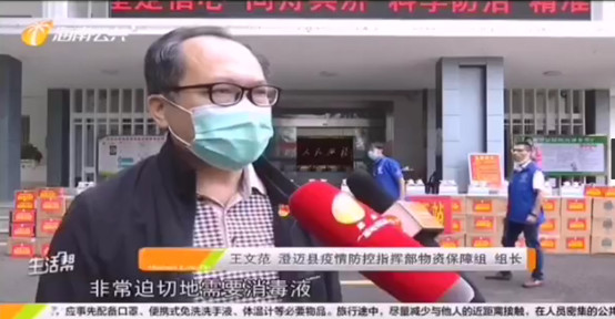 “这批物资非常及时,我们澄迈在防疫过程当中,非常迫切的需要消毒液,感谢椰岛集团为我们提供这一批非常及时的保障物资。”——澄迈县疫情防控指挥部物资保障组组长 王文范