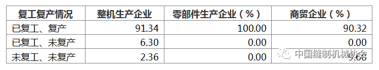 从反馈信息来看,在统计范围内,当前企业复工率达93.53%,比上期提高2.34个百分点;人员返岗数量增加了近5000人,人员返岗率达84.01%,比上期提高2.60个百分点;产能提升至66.49%,较上期提高3.32个百分点,缝制机械企业复工复产稳步推进。现将反馈信息汇总如下:在所有调研企业中,有93.53%的企业已经复工,复工人数占正常生产情况下用工人数的84.01%,企业产能平均恢复至66.49%,企业复工复产情况好转,行业生产逐渐步入正常轨道。另外,有6.47%的企业由于人员尚未返岗、规避疫情风险、政府限制开工、等待复工审批、招工难订单少等原因暂未复工。从企业类型来看(图1),在统计范围内,整、零制造企业复工步伐加快,复工率高于商贸企业。整机企业有91.34%已复工复产,较上期提高1.02个百分点;零部件企业已全数复工复产,较上期提高2.70个百分点。所调研31家商贸企业中,大多数企业都在三月初开始复工,目前尚有9.68%的企业尚未复工。