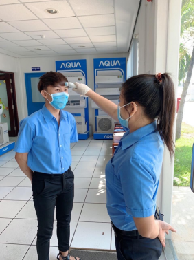 (图片说明:AQUA越南员工在接受入园体温监测)