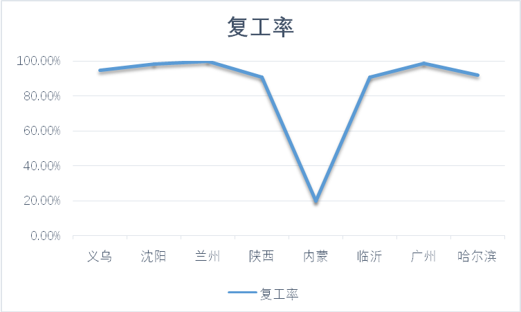 文教办公用品专业市场开业复工率整体较高,除内蒙地区为20%外,普遍在91%以上;广州达99%,兰州地区更是达到了100%。