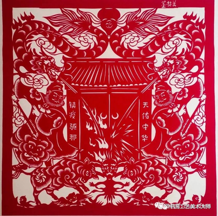 《镇灾驱邪,天佑中华》运用陕北文化色彩,结合民谚“七灾八难,黄牛顶散”,民间习俗“贴门神,保平安”,剪纸元素“龙腾虎跃”,为战疫前线送上来自黄土地人民镇疫驱邪,天佑中华的一片心愿。