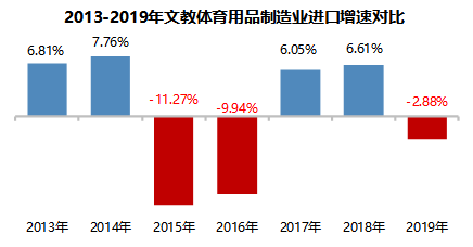 2019年,全国文教体育用品制造业累计完成进口额26.58亿美元,同比下降2.88%,增速比上年下降9.49个百分点,比同期轻工业总体进口增速低10.58个百分点。