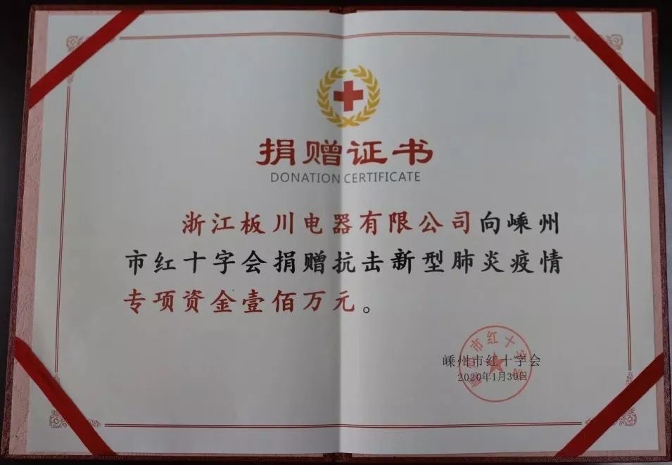 1月30日,浙江板川电器有限公司向嵊州市红十字会各捐赠人民币100万元,用于支援武汉抗击新型肺炎。