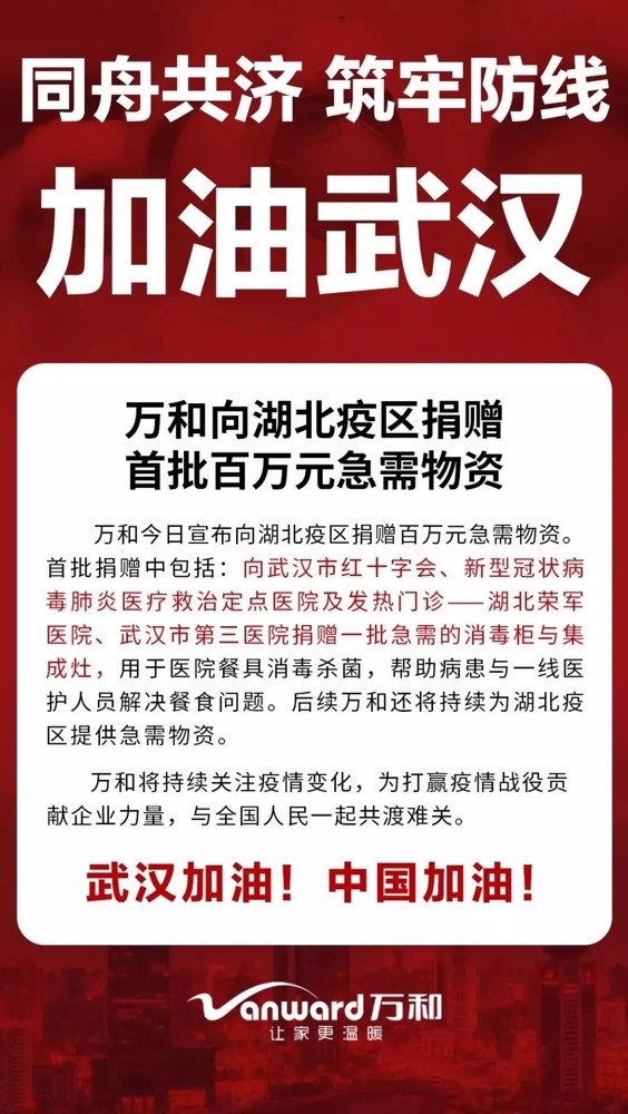 1月28日,面对疫情的进一步发展,为了缓解医疗物资紧缺、医护人员超负荷工作、饮食生活及用餐卫生无法保障等严峻问题,万和积极响应需求,助力武汉,首期将向武汉市红十字会、湖北荣军医院、武汉市第三医院捐赠一批所需消毒柜与集成灶。